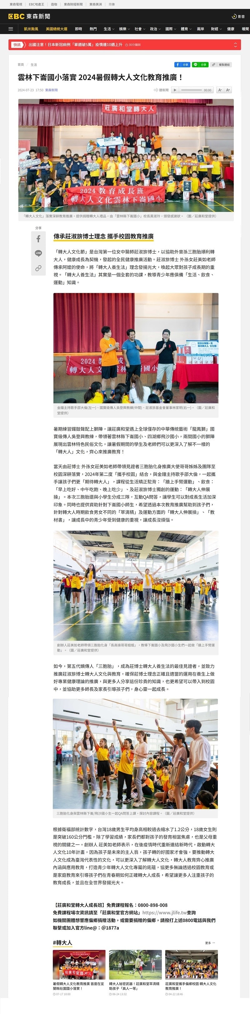 莊廣和堂創辦人莊美如老師提出「轉大人文化」10年計畫,她強調,孩子是國家的未來,若孩子能夠順利成長,國家才會更強大,因此她倡議推廣「轉大人文化」,希望這項文化能成為台灣具有代表性的特色,讓更多人了解並重視。「轉大人文化」計畫的核心是透過校園教育與家庭教育,引導青少年在青春期正確地成長,並促進大眾對孩子教育成長的重視,並希望能在全世界發揚光大。