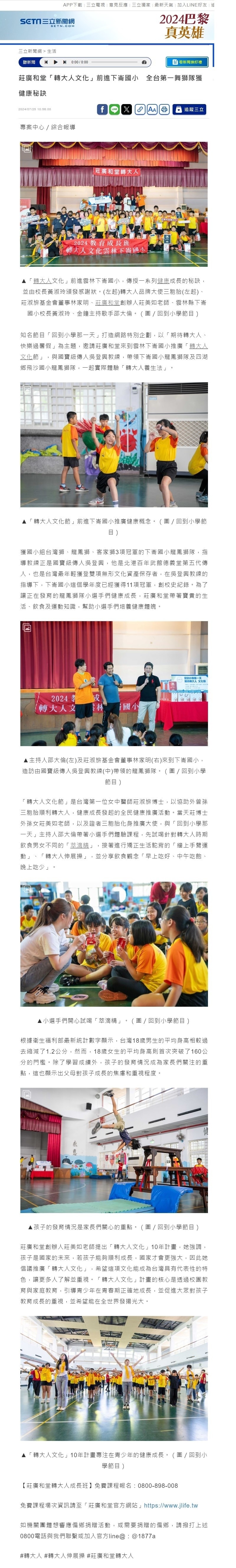 「轉大人文化節」是台灣第一位女中醫師莊淑旂博士,以協助外曾孫三胞胎順利轉大人,健康成長發起的全民健康推廣活動。當天莊博士外孫女莊美如老師,以及證者三胞胎化身推廣大使,與「回到小學那一天」主持人邵大倫帶著小選手們體驗課程,先試喝針對轉大人時期飲食男女不同的「萃滴精」,接著進行矯正生活駝背的「牆上手臂運動」、「轉大人伸展操」,並分享飲食觀念「早上吃好、中午吃飽、晚上吃少」。