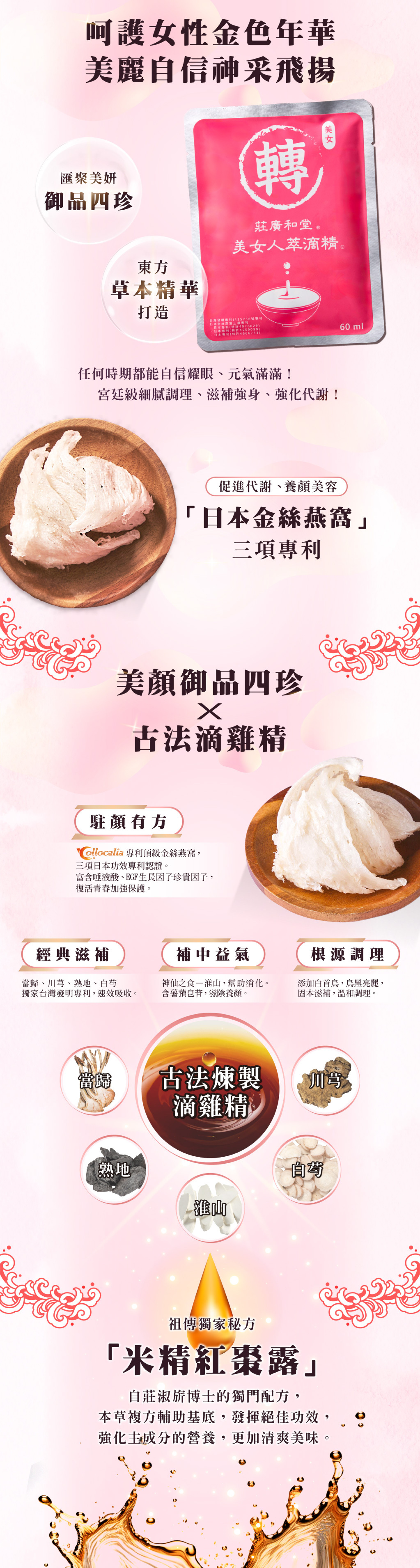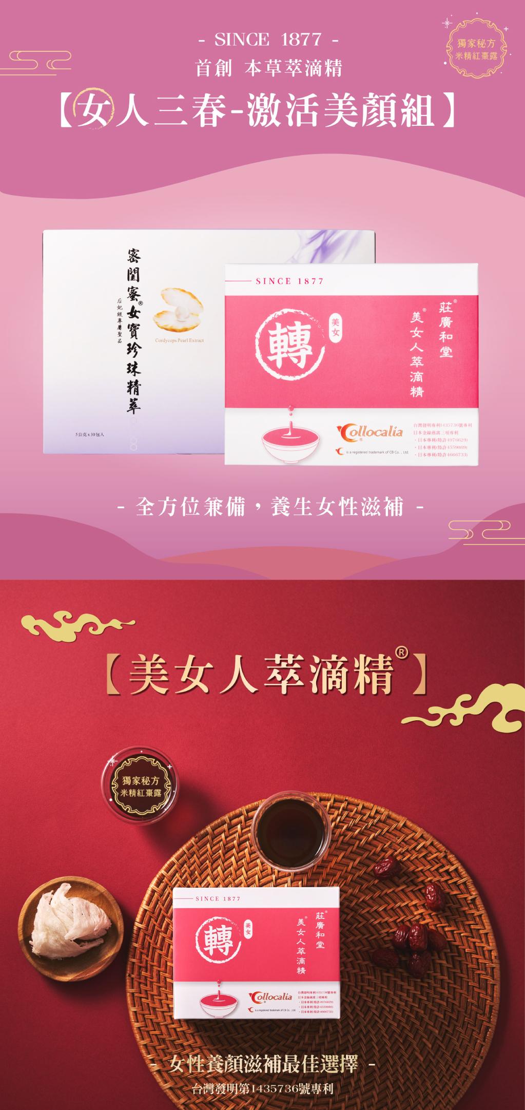 莊淑旂博士「女人三春」理論實踐首選女人草本+日本專利金絲燕窩+純煉滴雞精,熟齡女拾遺瑰寶。