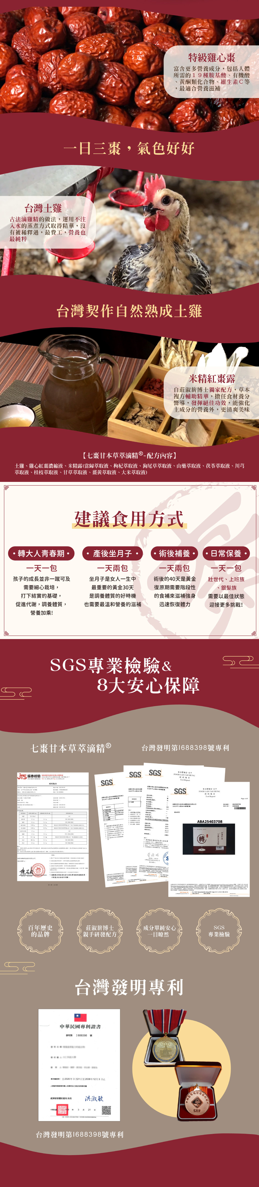 ✨選用特級雞心棗,嚴選草本複方,及台灣契作自然熟成土雞,以黃金比例特製而成。促進代謝,滋補強身,調節生理機能